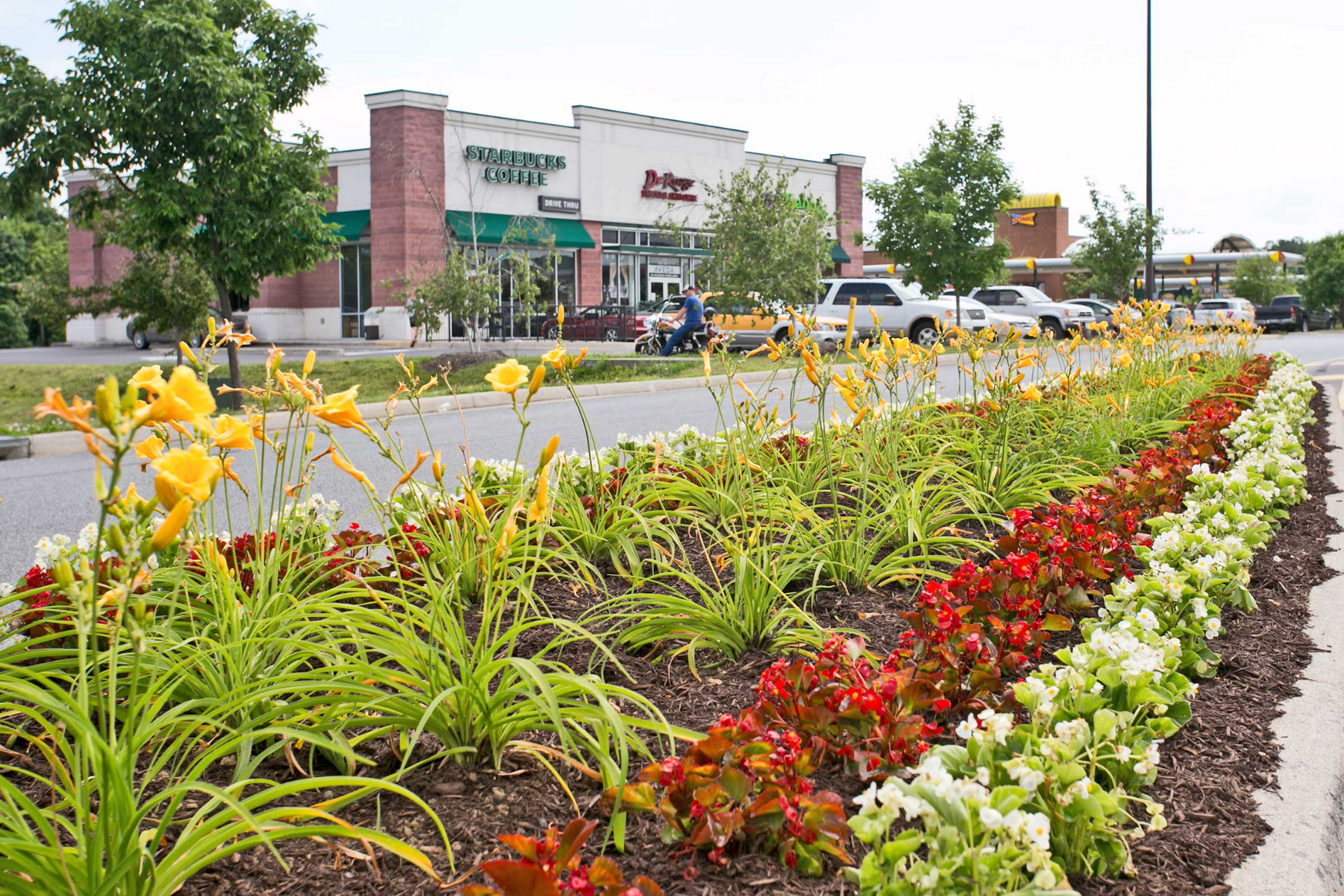 Commercial-grade equipment is used to maintain large areas efficiently, from open land to landscaped sections around shopping centers and office buildings. Services include mowing, trimming, edging, mulch touch-ups, and clearing debris from common areas, walkways, and parking lots.